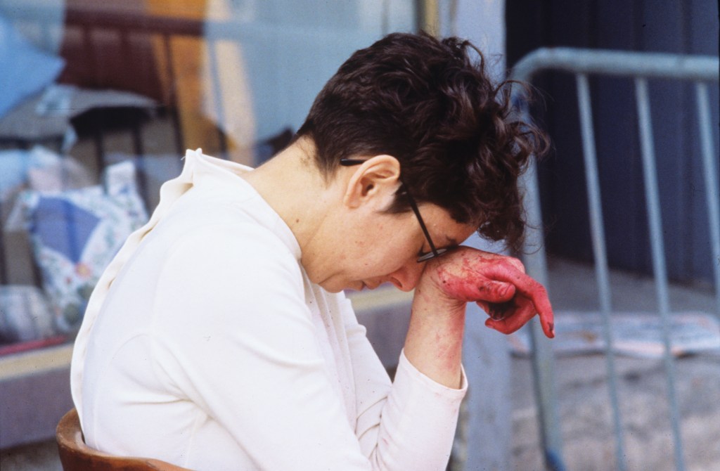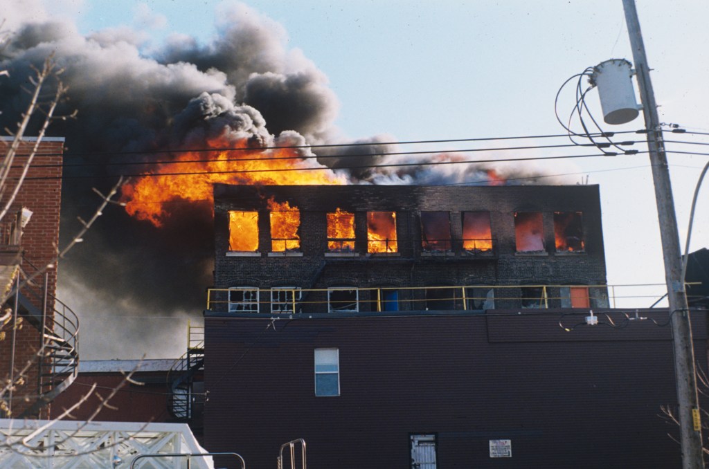 Devora's house burning, photo from s(us)tainingIn s(us)taining (1996), Devora performed an intimate, symbolic ritual on Montreal’s Notre Dame Street, peeling beetroots while barefoot in a white dress to process the trauma of losing their home to arson. This act, inspired by a dream they had of their Russian grandmother’s stained hands during Passover preparations, became a meditation on memory, resilience, and artistic rebirth. Through the presence of their photographer friend Mario Belisle, Devora found validation, witnessing, and a new artistic beginning, grappling with loss and exploring the themes of memory and healing.